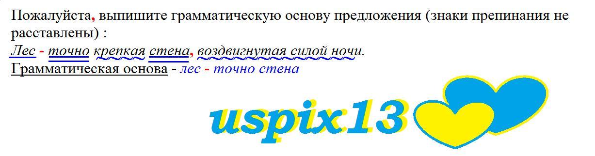 Пожалуйста выпишите грамматическую основу предложения (знаки препинания не расставлены) : Лес точно крепкая стена воздвигнутая силой ночи.