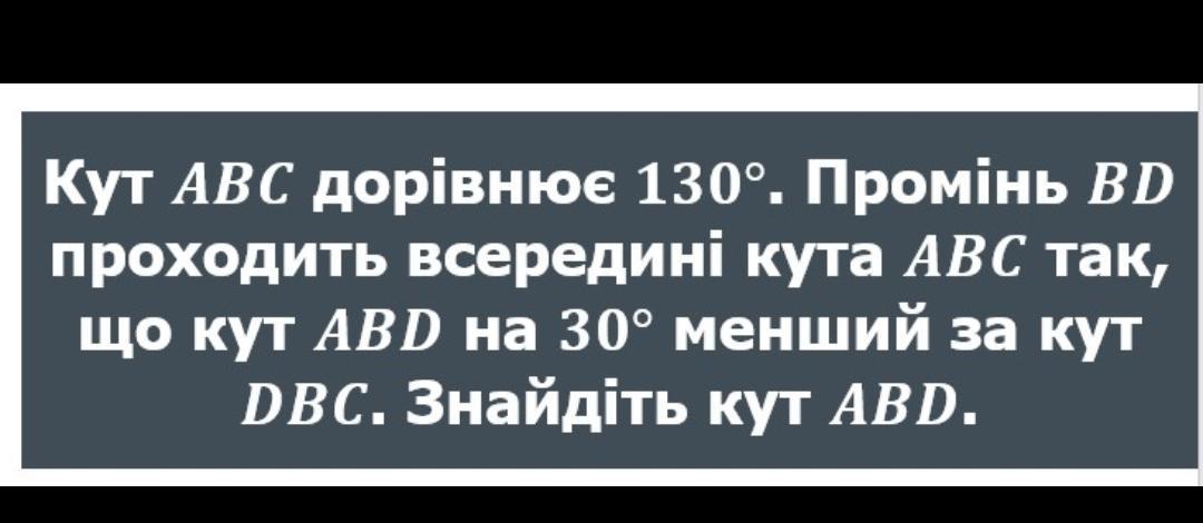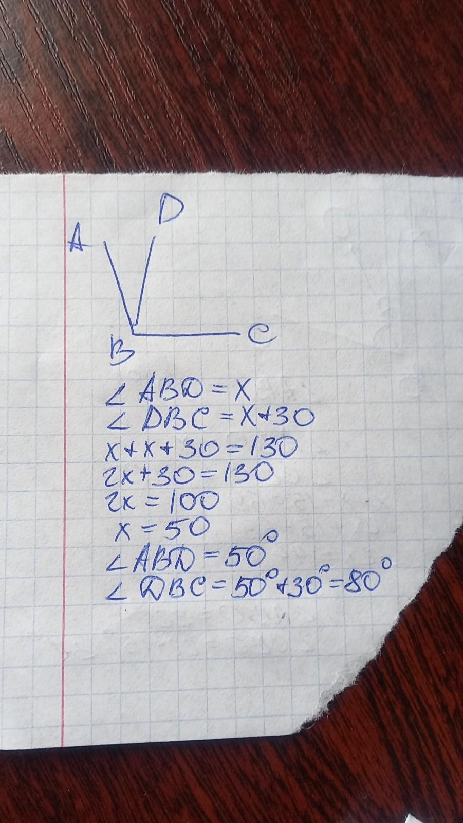 1) Якщо кут АВС дорівнює 130°, і кут ABD на 30° менший за кут DBC, то ми можемо знайти кут DBC, віднімемо його від кута АВС: