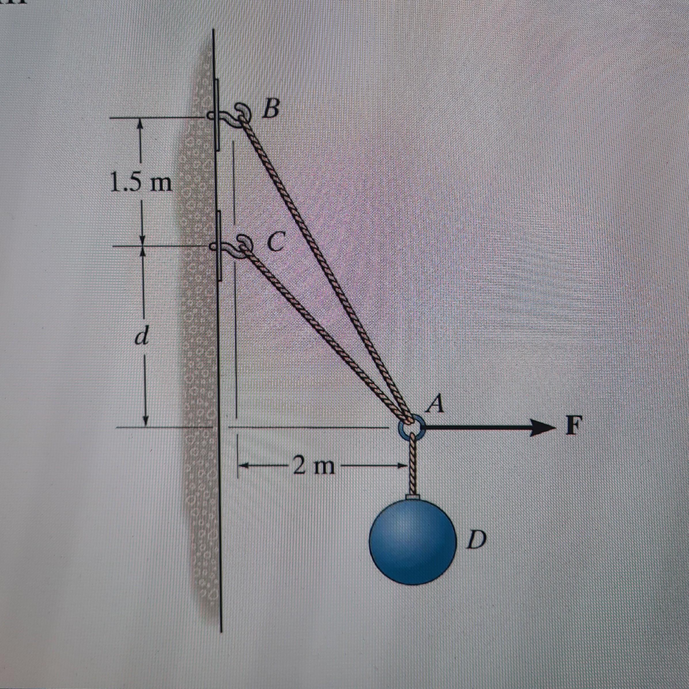 Determine the forces in cables AC and AB needed to hold the 20-kg ball D in equilibrium.Take F = 300 N and d = 1 m.