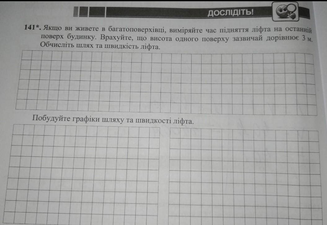 141*. Якщо ви живете в багатоповерхівці, виміряйте час підняття ліфта на останній поверх будинку. Врахуйте, що висота одного поверху зазвичай дорівнює 3 м Обчисліть шлях та швидкість ліфта та побудуйте графіки шляху та швидкості ліфта