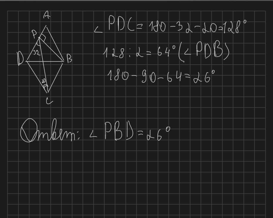 У ромбі ABCD з вершини тупого кута в провели висоту ВР на сторону AD . Знайдіть кут PBD, якщо ZCPD = 32°, PCD = 20°.