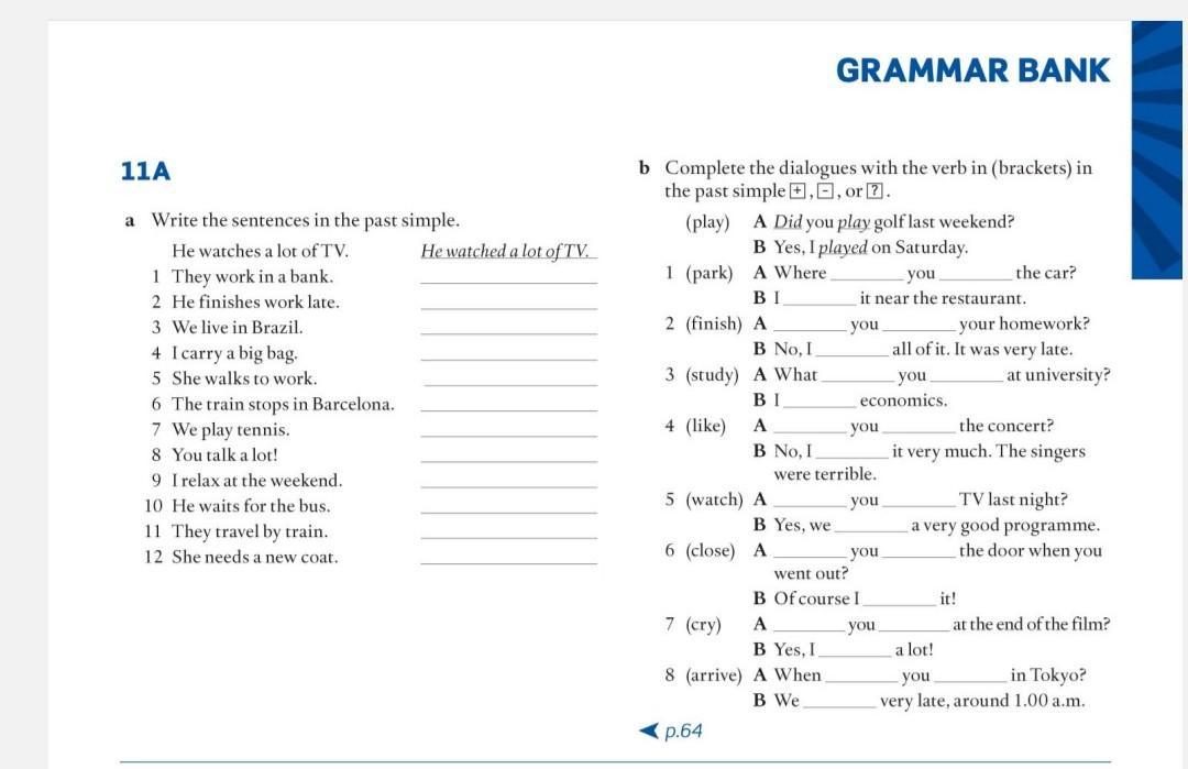 2. finish, Did you finish your homework? No, I didn't finish all of it. It was very late.