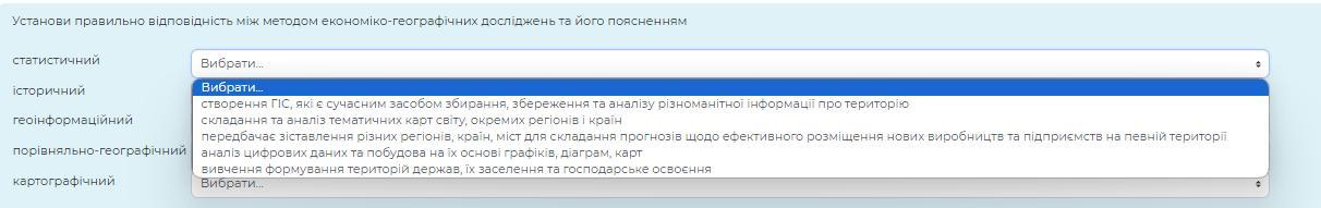 Правильна відповідь: картографічний → складання та аналіз тематичних карт світу, окремих регіонів і країн, геоінформаційний → створення ГІС, які є сучасним засобом збирання, збереження та аналізу різноманітної інформації про територію, статистичний → аналіз цифрових даних та побудова на їх основі графіків, діаграм, карт, порівняльно-географічний → передбачає зіставлення різних регіонів, країн, міст для складання прогнозів щодо ефективного розміщення нових виробництв та підприємств на певній території, історичний → вивчення формування територій держав, їх заселення та господарське освоєння