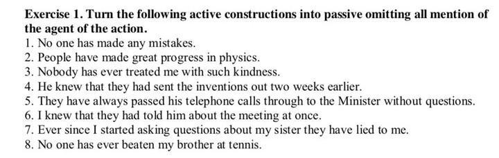 Exercise 1. Turn the following active constructions into passive omitting all mention of the agent of the action. 1. No one has made any mistakes. 2. People have made great progress in physics. 3. Nobody has ever treated me with such kindness. 4. He knew that they had sent the inventions out two weeks earlier. 5. They have always passed his telephone calls through to the Minister without questions. 6. I knew that they had told him about the meeting at once. 7. Ever since I started asking questions about my sister they have lied to me. 8. No one has ever beaten my brother at tennis.