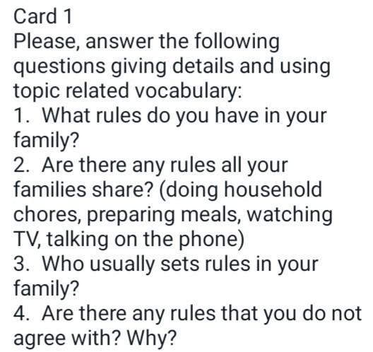 1. ин май фэмили ви донт хэв мэни рулс, бат ай кэн римембэ ту оф зэм. Фёст уан из ай шуд кип май клоузыс ин одэ, сэконд уан из ай шуд клин дишес афтэ ич мил. (in my family we don't have many rules, but i can remember two of the. First one is i should keep my clothes in order and the second one is i should clean dishes after each meal.)