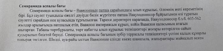 Табаны төртбұрышты, төрт қабатты алып құрылыс тепкішектері жоғары көтерілген сайын қусырылып биіктей береді. Семирамида аспалы бағының әрбір террасалы тепкішектері үстіне қалың құнарлы топырақ төгіледі, әрі соның бетіне Вавилонияның, Мидияның және басқа елдерден арнайы алдырған алуан түрлі жеміс ағаштары мен көк желекті бұталар отырғызылады. Шөлді, ауа райы ыстық Вавилония елінде көкке шаншыла, жапырақтары жайқалып өскен ағаштардың саясынан ескен салқын самалды аспалы бақ жергілікті тұрғындарды таң-тамаша қалдырады.