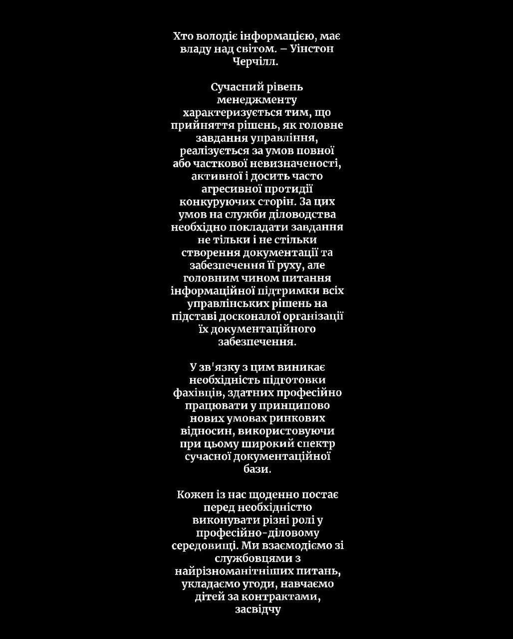 Хто володiє інформацією, мой володіє світом. Уiнстон Черчiлл Сучасний рівень менеджменту характеризується тим що прийняття рішень як головне завдання управління реалізується за умов повної або часткової невизначеності активної досить часто агресивної протидії конкуруючих сторін. За цих умов на служби діловодства необхідно покладати завдання не тiльки i не стільки створення документації та забезпечення її руху але головним чином питання інформаційної підтримки всіх управлінських Рiшень на підставі досконалої організації їх документацiйного забезпечення. У зв'язку з цим виникає необхідність підготовки фахівців здатних професійно працювати у принципово нових умовах ринкових відносин використовуючи при цьому широкий спектр сучасної документаційної бази. Кожен із нас щоденно постає перед необхідністю виконувати рiзнi ролi у професійно-діловому середовищі ми вашу роботу спілкуємося зі службовцями з найрізноманітніших питань укладаємо угоди навчаємо дітей за контрактами засвідчуємо у нотаріуса довіреності декларуємо в податковій інспекції свої прибутки. Як не розгубитися в купі паперів як правильно скласти потрібний документ як влучно дібрати слово чи вислів нарешті як швидко знайти правило за яким пишеться потрібне слово? Найважливішу інформацію про складання й оформлення різних типів документів ви можете отримати, навчаючись на спеціальностi. Підбором інформації обробкою й оформленням документiв сьогодні А спеціально підготовлений для документознавець інформаційний аналітик.