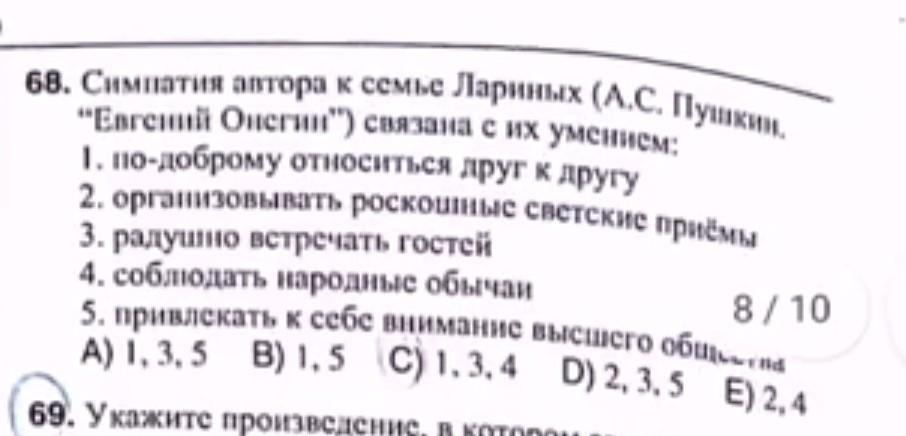 68. Симпатия автора к семье Лариных (А. С. Пушкин. "Евгений Онегин") связана с их умением: С) 1, 3, 4.