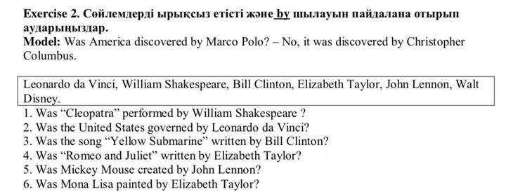 Exercise 2. Сөйлемдерді ырықсыз етісті және by шылауын пайдалана отырып аударыныздар. Model: Was America discovered by Marco Polo? -No, it was discovered by Christopher Columbus. Leonardo da Vinci, William Shakespeare, Bill Clinton, Elizabeth Taylor, John Lennon, Walt Disney. 1. Was "Cleopatra" performed by William Shakespeare? 2. Was the United States governed by Leonardo da Vinci? 3. Was the song "Yellow Submarine" written by Bill Clinton? 4. Was "Romeo and Juliet" written by Elizabeth Taylor? 5. Was Mickey Mouse created by John Lennon? 6. Was Mona Lisa painted by Elizabeth Taylor?