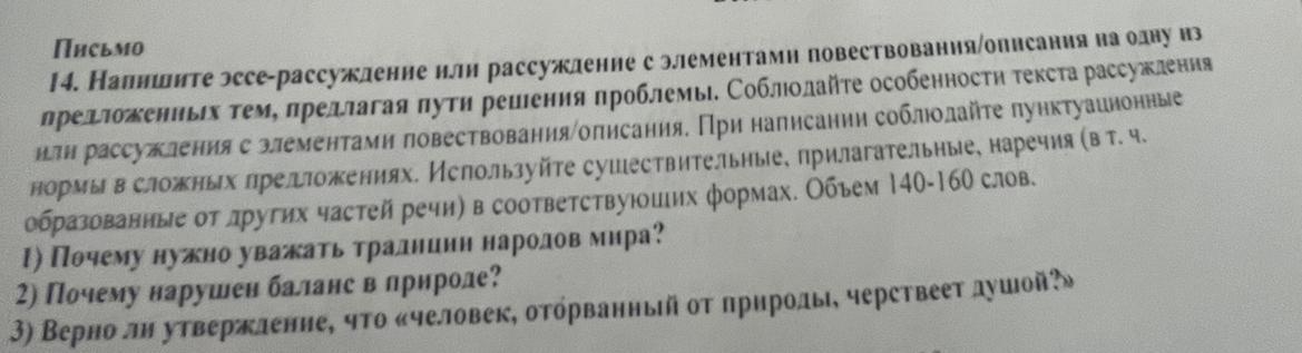14. Напишите эссе-рассуждение или рассуждение с элементами повествования/описания на одну из предложенных тем, предлагая пути решения проблемы. Соблюдайте особенности текста рассуждения или рассуждения с элементами повествования/описания. При написании соблюдайте пунктуационные нормы в сложных предложениях. Используйте существительные, прилагательные, наречия (в т. Ч. образованные от других частей речи) в соответствующих формах. Объем 140-160 слов.