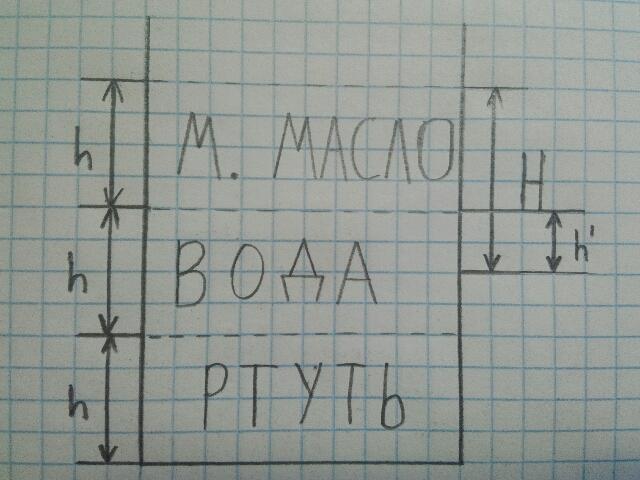 Люди помогите!в сосуде один над другим находится три слоя несмешивающихся жидкостей :воды ,машинного масла и ртути .высота каждого слоя 5см . сделайте рисунак с пояснениями, указав нв нем расположение слоев . определите давление жидкостей на дно сосуда и на глубине 7,5см.