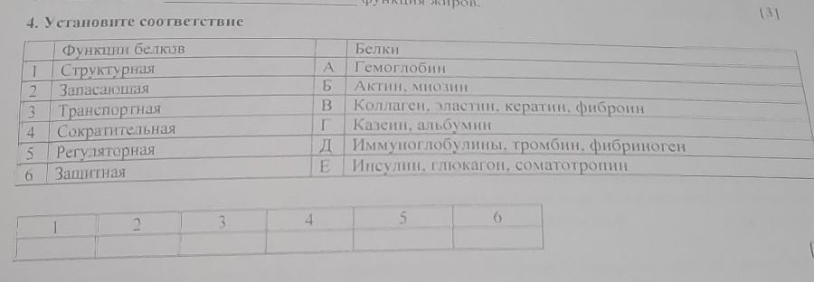 4. Установите соответствие Функции белков 1 Структурная 2 Запасающая 3 Транспортная Сократительная Регуляторная Защитная 4 S 6 2 рисунок 3 4 Белки A Гемоглобин АКТИН, МИОзин Б B Коллаген, эластин, кератин, фиброин Казеин, альбумин r д Иммуноглобулины, тромбин, фибриноген E Инсулин, глюкагон, соматотропин 6