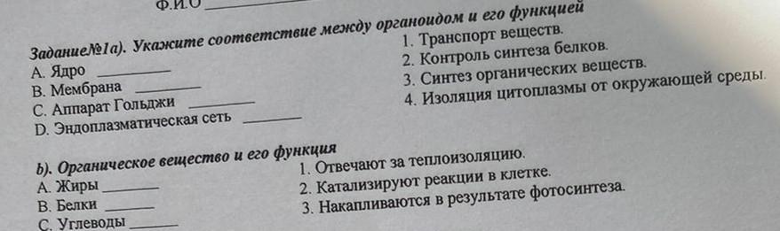 Задание№1а). Укажите соответствие между органоидом и его функциеl А. Ядро В. Мембрана С. Аппарат Гольджи D. Эндоплазматическая сеть b). Органическое вещество и его функция А. Жиры В. Белки С. Углеводы 1. Транспорт веществ. 2. Контроль синтеза белков. 3. Синтез органических веществ. 4. Изоляция цитоплазмы от окружающей среды. 1. Отвечают за теплоизоляцию. 2. Катализируют реакции в клетке. 3. Накапливаются в результате фотосинтеза. подложение [4] [3]