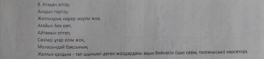 8. Атадан алтау, Анадан тертеу, Жалгыздык көрер жерiм жок. Ағайын бек көп, Айтамын ептеп, Сезiмдi ұғар елiм жок. Моласындай бақсының Жалғыз калдым - тап шыным!-деген жолдардағы ақын бейнесін (iшкi сезiм, толғанысын) көрсетіңіз.