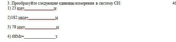 3. Преобразуйте следующие единицы измерения в систему СИ: 1) 23 км = м 2)182 мкм = м 3) 78 мм= м 4) 68мт= Т