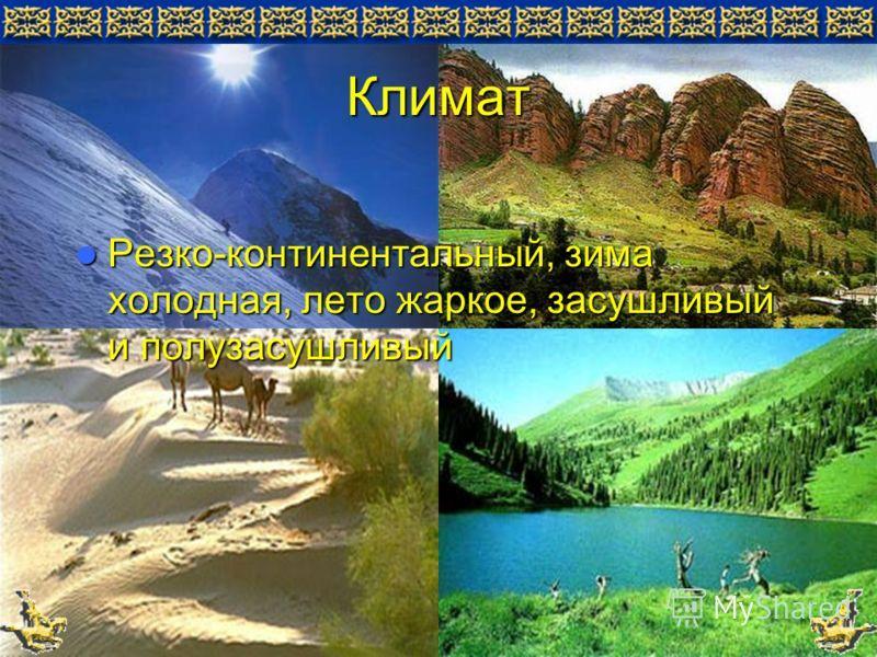 В Казахстане очень не предсказуймый климат. Бывает и холодно и жарко . В Казахстане в разных городах есть свой климат давайте возьмём на пример Алматы в Алмате своеобразно бывает и холодно и жарко к примеру утром холодно днем жарко. Казахстан из самый не придсказуймых стран по Климату.