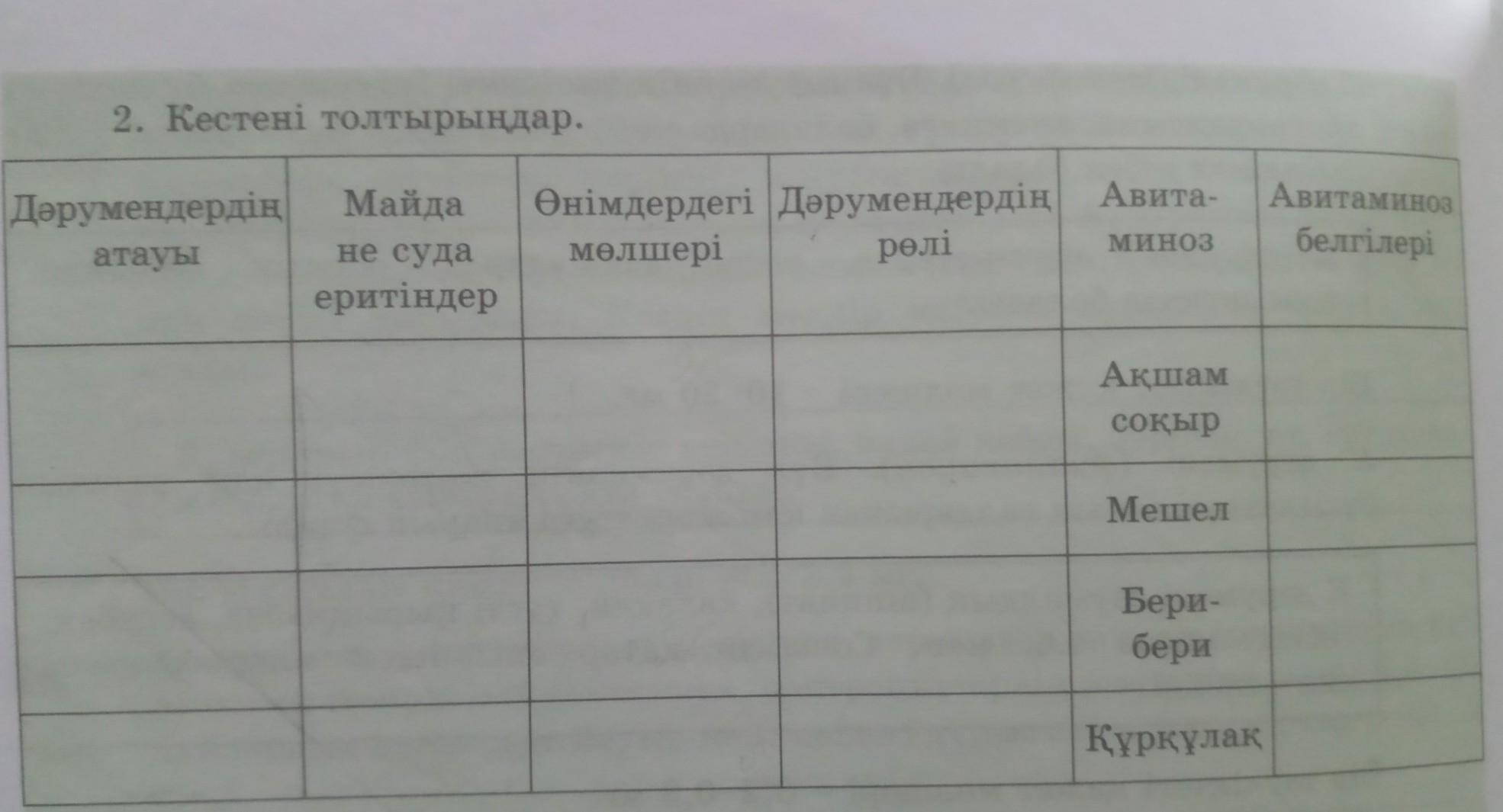 2. Кестені толтырындар. Дәрумендердің Майда атауы не суда еритiндер Авитаминоз МИНОЗ белгiлерi Өнімдердегі дәрумендердің Авита- мөлшері релі Акшам сокыр Мешел Бери- бери Куркулак
