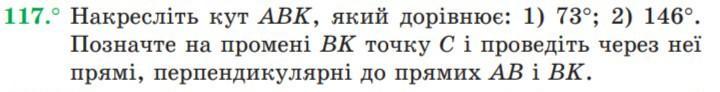 117.° Накресліть кут АВК, який дорівнює: 1) 73°; 2) 146°. Позначте на промені ВК точку С і проведіть через неї прямі, перпендикулярні до прямих АВ і ВК.