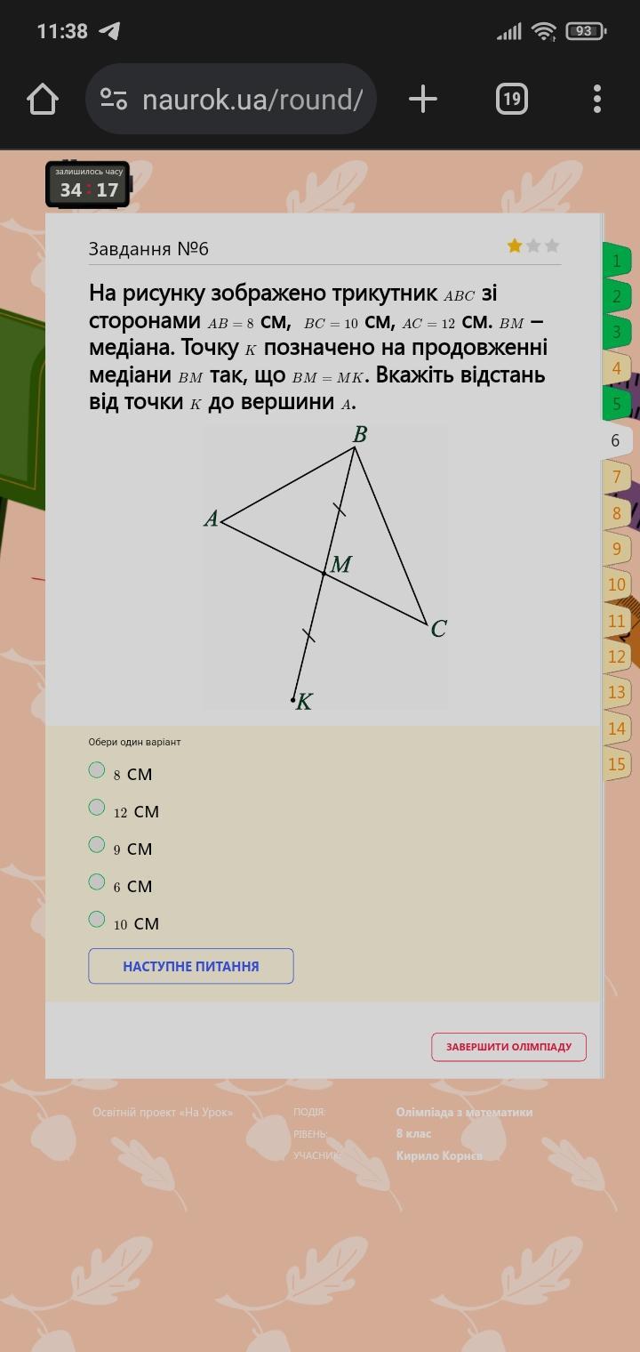 На рисунку зображено трикутник АВС Зі сторонами AB = 8CM BC = 10C*M_{I} AC = 12 СМ. ВМ - медіана. Точку к позначено на продовженні медіани вм так, що BM = MK Вкажіть відстань від точки к до вершини а