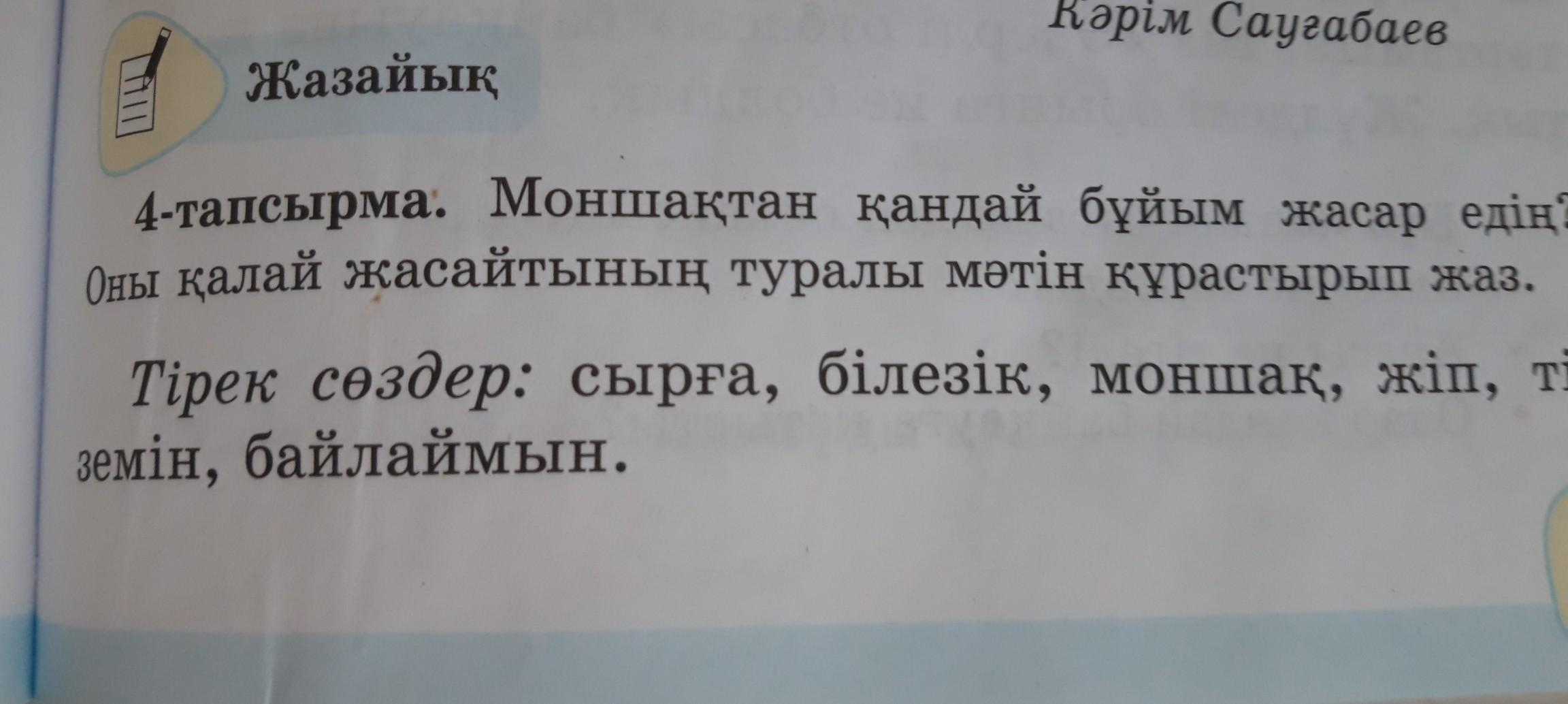 жазайық 4-тапсырма. Моншактан кандай бұйым жасар едің? Оны калай жасайтынын туралы мәтін құрастырып жаз. Тірек сөздер: сырға, білезік, моншақ, жіп, ті- земiн, байлаймын.
