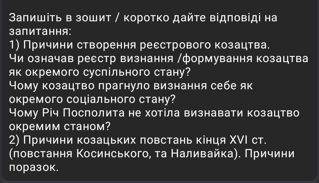 Чи означав реєстр визнання /формування козацтва як окремого суспільного стану? Чому козацтво прагнуло визнання себе як окремого соціального стану? Чому Річ Посполита не хотіла визнавати козацтво окремим станом? 2) Причини козацьких повстань кінця XVI ст. (повстання Косинського, та Наливайка). Причини поразок. Відповідь на домашнє завдання Відповідь