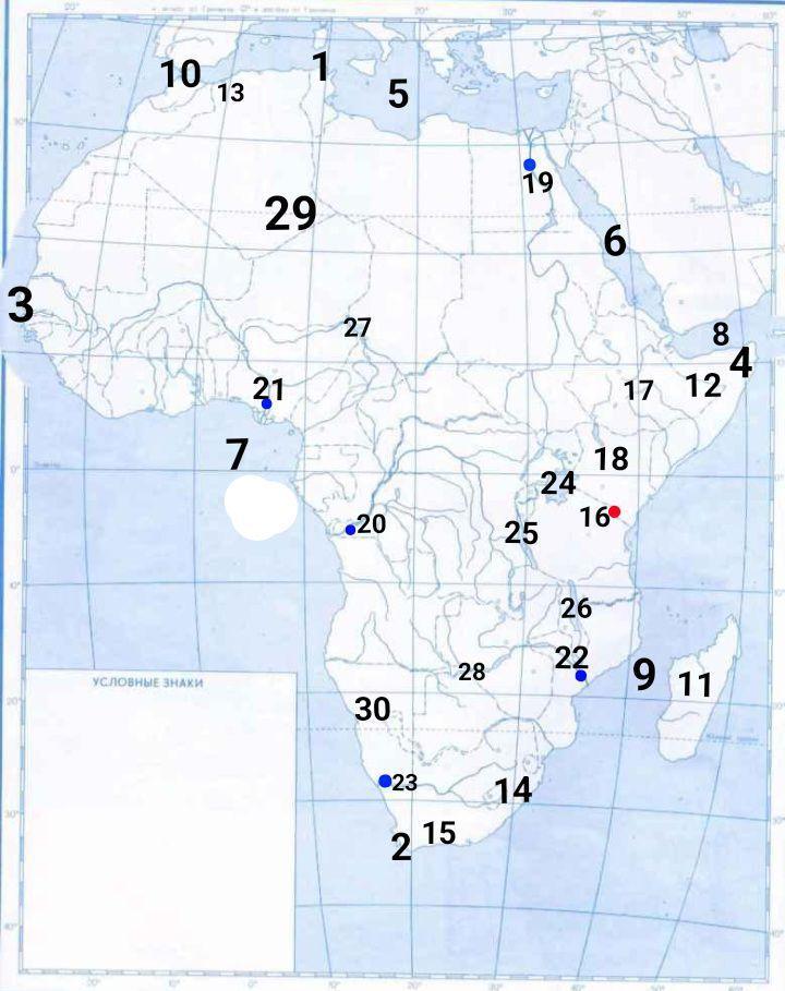 Відповідь нижче на фото контурній карті! Географічні номенклатури Африки пронумеровані чорним кольором від 1 до 30.