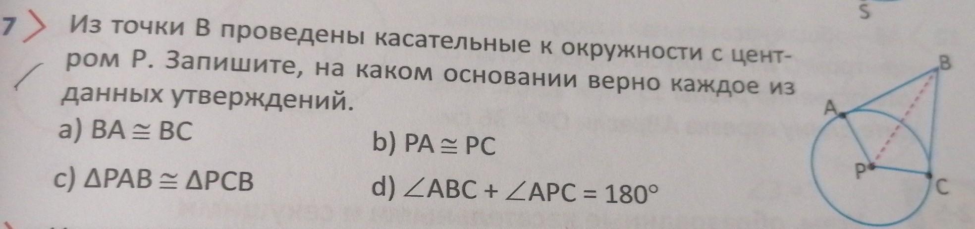 7 Из точки В проведены касательные к окружности с цент- ром Р. Запишите, на каком основании верно каждое из данных утверждений. A a) BA = BC c) ДРАВДРСВ b) PA= PC d) ZABC + ZAPC = 180° Р В C