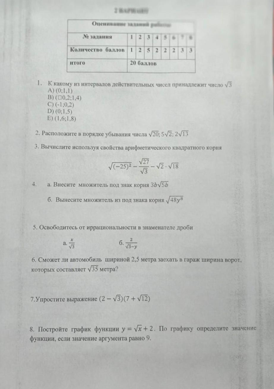 Оцени на № задания Количество баллов 12522233 итого 1234 20 баллов 5 1. К какому из интервалов действительных чисел принадлежит число √3 A) (0:1,1) B) (00,2;1,4) C) (-1:0,2) D) (0:1,5) E) (1,6;1,8)