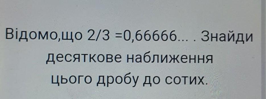 Відомо,що 2/3 =0,66666... . Знайди десяткове наближення цього дробу до сотих. допоможіть будь ласка!!! дам 20 балів