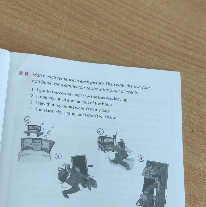 B Match each sentence to each picture. Then write them in your notebook using connectors to show the order of events.