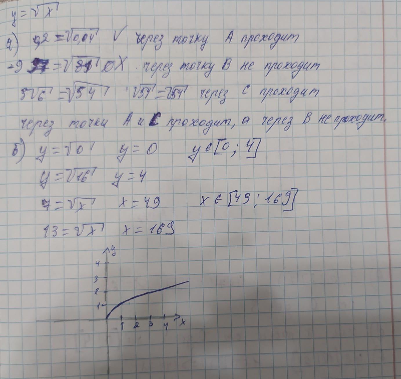 8. [5 баллов] Дана функция у = √x . а) Проходит ли график этой функции через точки А (0,04; 0,2), В (81; - 9), С(54; 3 √6 )? б) Какие значения будет принимать данная функция, если x ∈ [0; 16] в) Найдите значения аргумента, если у є [7; 13]