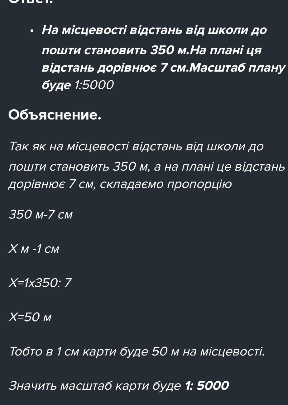 На місцевості відстань від дитячого майданчика до школи становить 1000 м. На карті ця відстань дорівнює 10 см. Який масштаб карти?