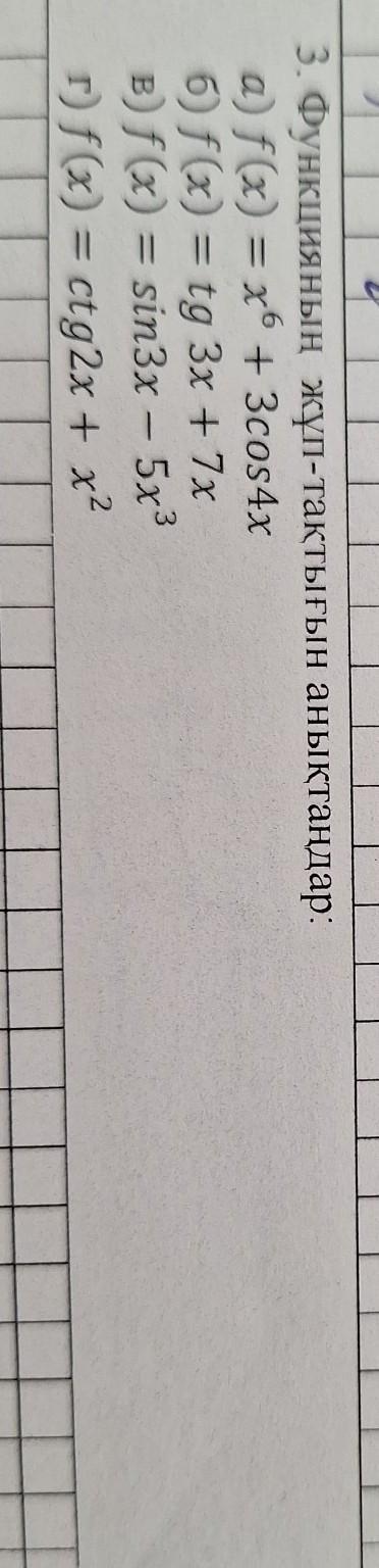 3. Функцияның жұп-тақтығын анықтаңдар: a) f(x) = x6 + 3cos4x 6) f(x) = tg 3x +7x B) f(x) = sin3x-5x3 г) f(x) = ctg2x + x²