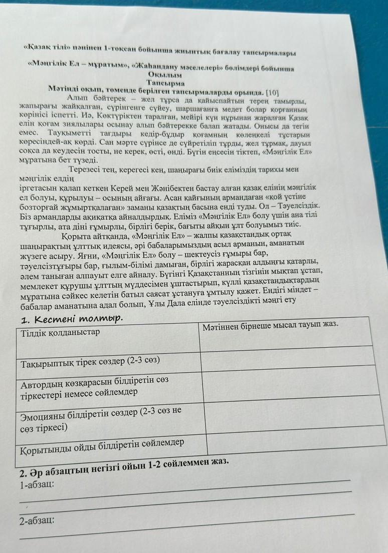 Алып бәйтерек Тапсырма Мәтiндi окып, төменде берілген тапсырмаларды орында. [10] жел турса да кайыспайтын терен тамырлы, жапырагы жайкалган, сүрінгенге сүйеу, шаршағанға медет болар корганнын көрінісі іспетті. Из, Көктүрiктен таралган, мейiрi күн нұрынан жаралған Казак елiн когам зиялылары осынау алып бәйтерекке балап жатады. Онысы да тегiн емес. Тауқыметтi тагдыры кедір-бұдыр когамнын көлеңкелі тұстарын көресіндей-ак кердi. Сан мәрте сурiнсе де суйретiлiп тұрды, жел турмак, дауыл сокса да кеудесін тосты, не керек, естi, ендi. Бүгiн еңсесін тіктеп, «Мәңгілік Ел» мұратына бет түзеді. Терезесі тең, керегесi кен, шаңырағы биiк елiмiздiң тарихы мен монгiлiк елдiң - iргетасын қалап кеткен Керей мен Жәнібектен бастау алган казак елiнiн мәнгiлiк ел болуы, құрылуы - осынын айғағы. Асан кайгынын армандаган «кой үстiне бозторгай жум ырткалаган» заманы казактын басына ендi туды. Ол - Тәуелсіздік. Біз армандарды акикатка айналдырдық. Елiмiз «Мәңгілік Ел» болу үшін ана тiлi тұғырлы, ата дiнi ғұмырлы, бiрлiгi берiк, бағыты айкын ұлт болуымыз тиiс. Қорыта айтканда, «Мәңгілік Ел» - жалпы казакстандык ортак шанырактын ұлттык идеясы, әрi бабаларымыздың асыл арманын, аманатын жүзеге асыру. Яғни, «Мәңгілік Ел» болу - шектеусiз ғұмыры бар, тәуелсізтұғыры бар, ғылым-бiлiмi дамыған, бiрлiгi жарасқан алдынгы катарлы, әлем таныған алпауыт елге айналу. Бүгінгі Қазақстанның тiзгiнiн мыктап ұстап, мемлекет құрушы ұлттын мүддесімен ұштастырып, күллi казакстандыктардын мұратына сәйкес келетін батыл саясат ұстануға ұмтылу кажет. Ендiгi мiндет- бабалар аманатына адал болып, Ұлы Дала елiнде тәуелсiздiктi мәңгі ету 1. Кестені толтыр. Тiлдiк колданыстар Мәтіннен бірнеше мысал тауып жаз. Тақырыптық тірек сөздер (2-3 сөз) Автордың көзқарасын білдіретін сөз тіркестерi немесе сөйлемдер Эмоцияны білдіретін сөздер (2-3 сөз не сөз тiркесi) Қорытынды ойды бiлдiретiн сойлемде