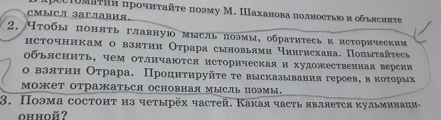 чтобы понять главную мысль поэмы, обратитесь к историческим источникам о взятии Отрара сыновьями чингисхана. Попытайтесь объяснить, чем отличаются историческая и художественная версии о взятии Отрара. Процитируйте те высказывания героев, в которых может отражаться основная мысль поэмы.