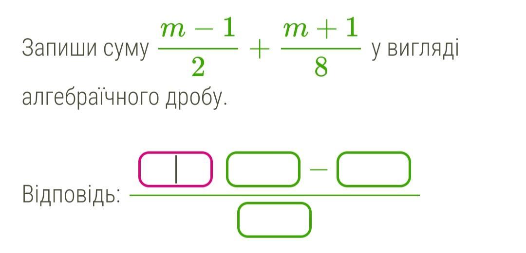 Запиши суму m−12+m+18 у вигляді алгебраїчного дробу.