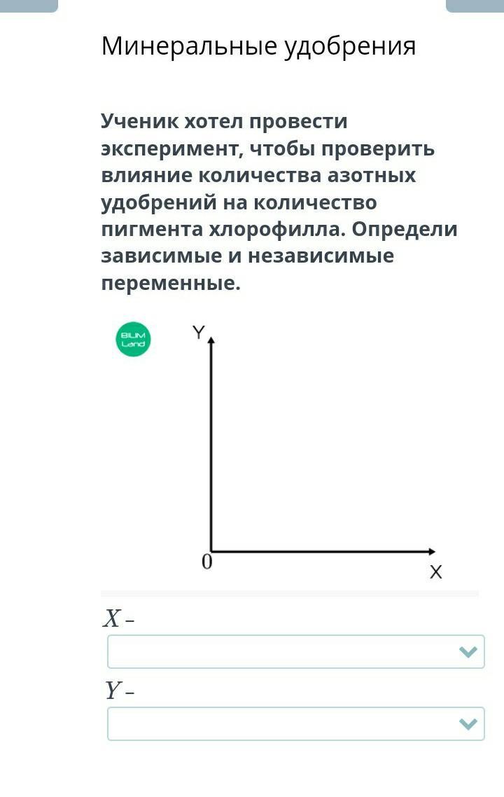 Ученик хотел провести эксперимент, чтобы проверить ВЛИЯНИЕ количества азотНЫХ удобрений на количество пигмента хлорофилла. Определи зависимые и независимые переменные. BILIM Land X- Y- Проверить X