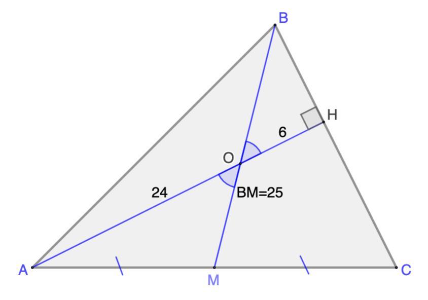 В треугольнике ABC высота AH равна 30, медиана BM равна 25, расстояние от точки пересечения отрезков BM и AH до стороны BC равно 6.