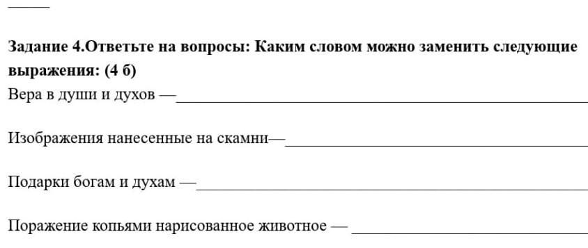 Задание 4.Ответьте на вопросы: Каким словом можно заменить следу выражения: (4 б) Вера в души и духов Изображения нанесенные на скамни- Подарки богам и духам Поражение копьями нарисованное животное