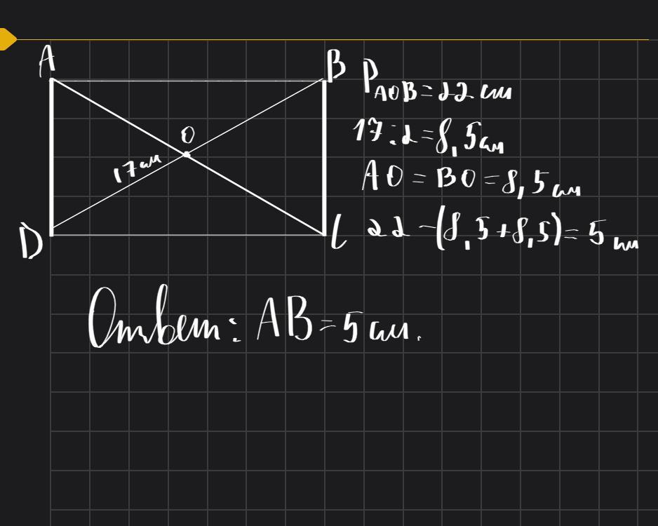 1.В прямоугольнике ABCD точка О является точкой пересечения диагоналей BD = 17 см, а периметр треугольника АОВ равен 22 см. Найдите длину стороны АВ. A)5 C) 11 D) 17 B) 8,5