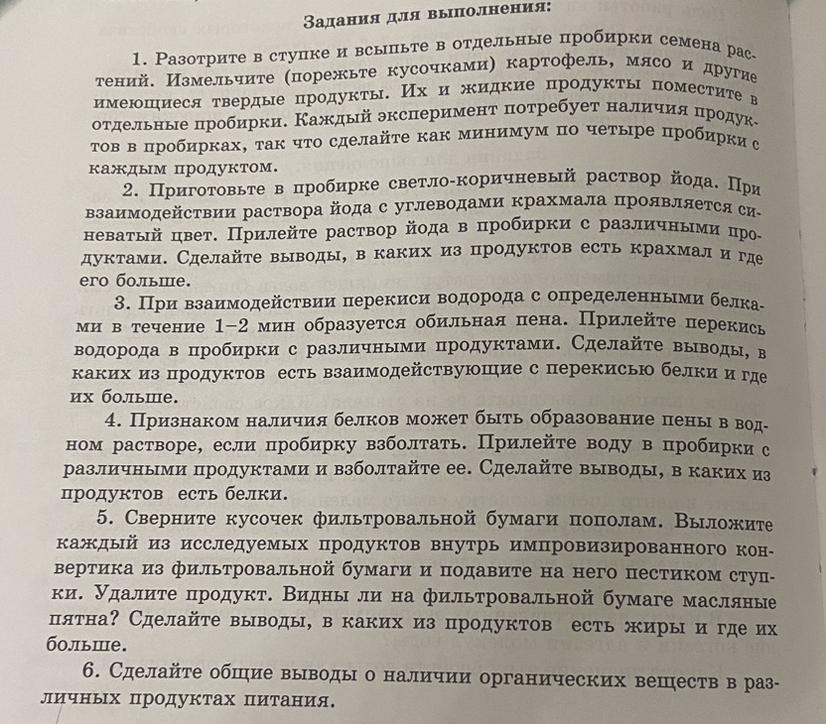 1. Это инструкция для проведения химического анализа различных продуктов, чтобы определить наличие органических компонентов, таких как крахмал, белки, жиры.