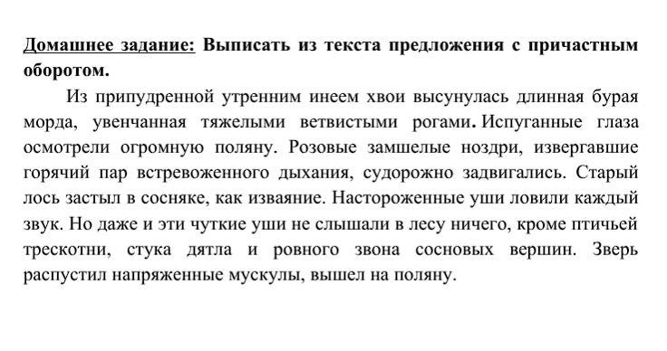 Ответ:Из припудренной утренним инеем хвои высунулась длинная бурая морда, увенчанная тяжелыми ветвистыми рогами.