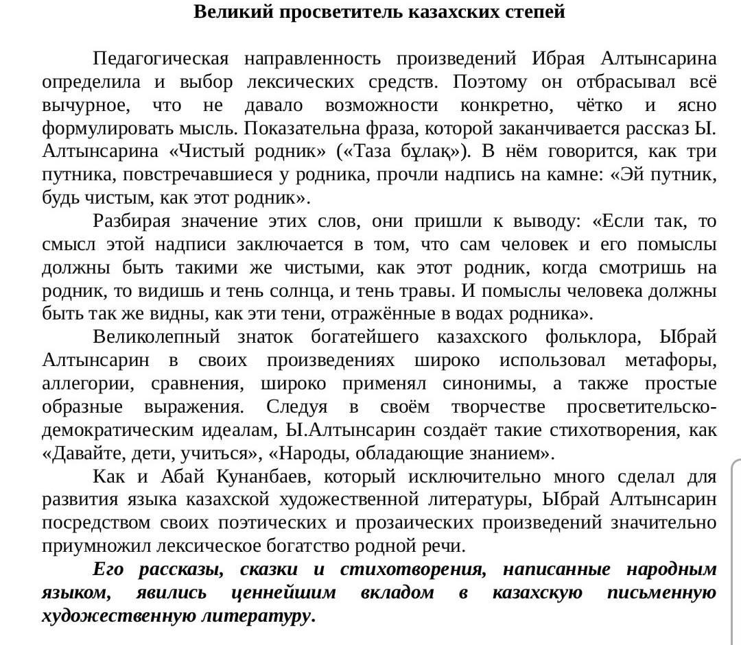 В тексте рассказывается о важной роли и вкладе Ибрая Алтынсарина, великого просветителя казахских степей, в развитие казахской литературы. Его педагогическая направленность определила выбор лексических средств в его произведениях. Он предпочитал ясность и конкретность, отбрасывая излишнюю выразительность. Это видно в заключительной фразе его рассказа "Чистый родник," где он призывает быть чистым, как родник.