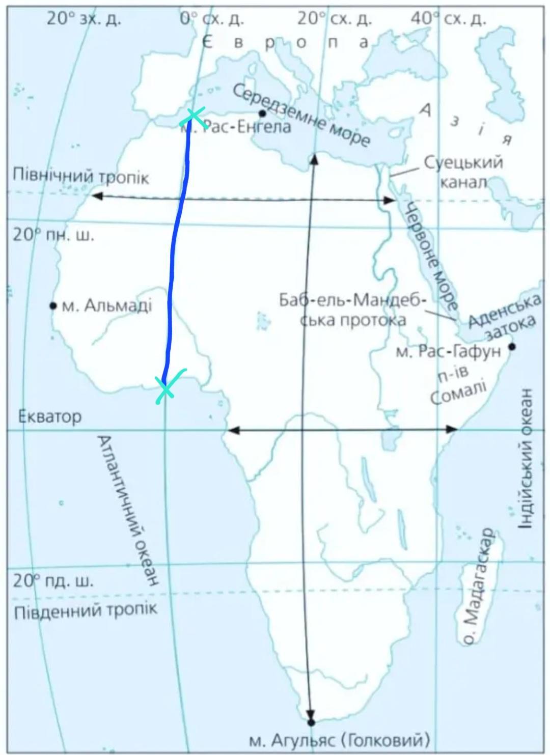 за градусною сіткою обчисліть протяжність Африки з півночі на південь в градусах і кілометрах за 0° д.