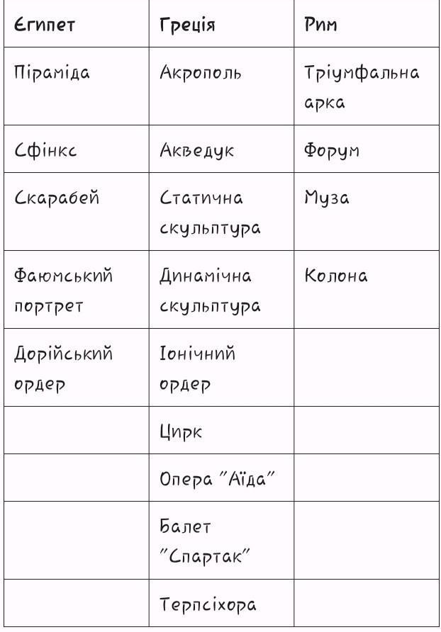 Піраміда, акведук, тріумфальна арка, Акрополь, статична скульптура, динамічна скульптура, муза, форум, колона, іонічний ордер, скарабей, цирк, сфінкс, фаюмський портрет, дорійський ордер, опера Аіда, балет Спартак, терпсіхора.