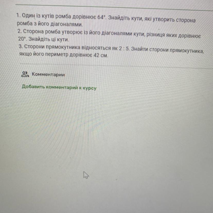 2. сторона і діагоналі утворюють прямокутний трикутник тобто один кут 90градусів, в суммі в трикутника 180 градусів тобто на інши два кути дається 90градусів, 90/2 = 45 щоб була різниця в 20 градусів потрібто від одного 45 відняти 10 й до одного додати 10
