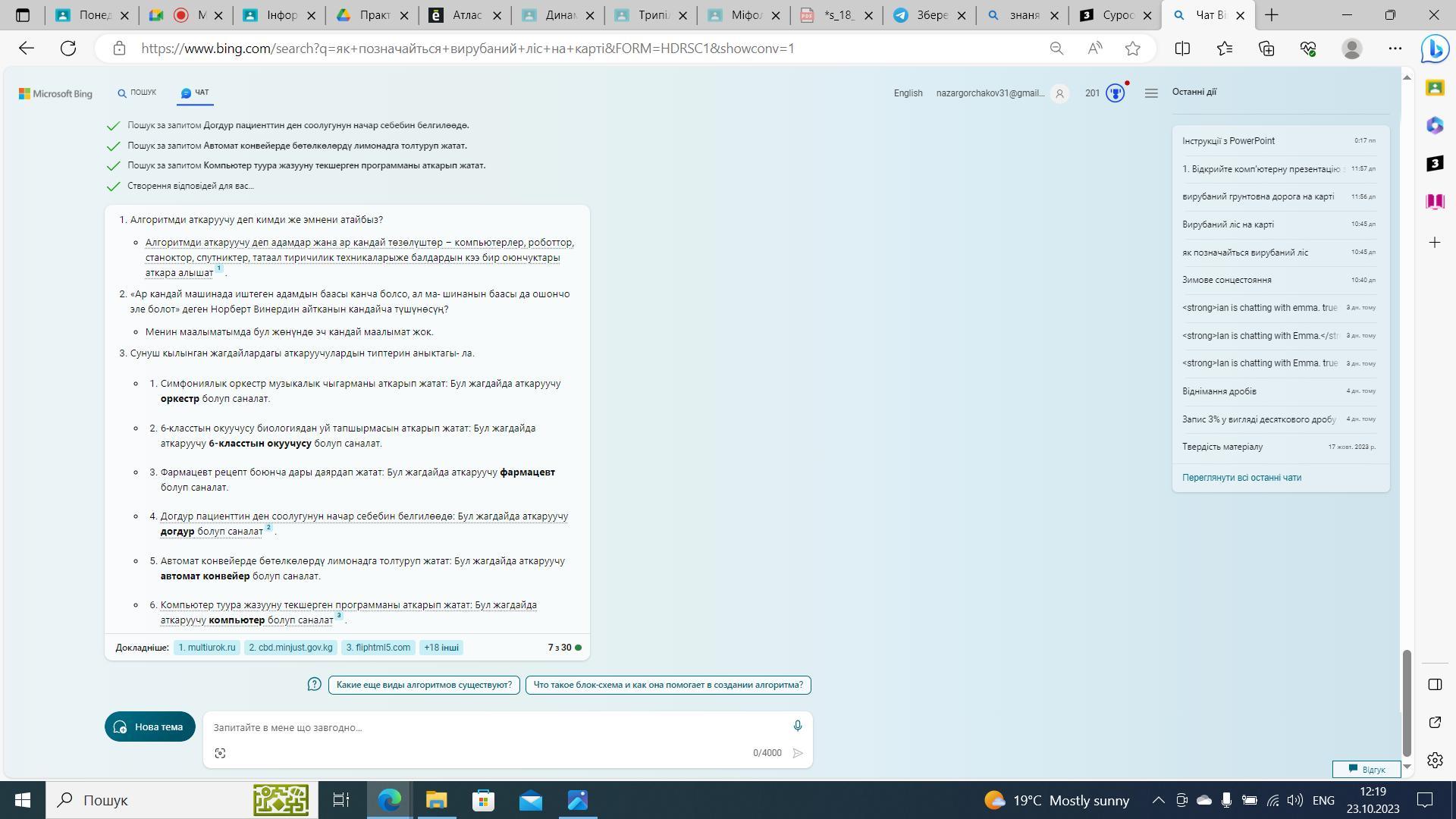 Суроолор жана тапшырмалар 1. Алгоритмди аткаруучу деп кимди же эмнени атайбыз? 2. «Ар кандай машинада иштеген адамдын баасы канча болсо, ал ма- шинанын баасы да ошончо эле болот» деген Норберт Винердин айтканын кандайча түшүнөсүң? 3. Сунуш кылынган жагдайлардагы аткаруучулардын типтерин аныктагы- ла. Жообуңарды негиздегенге даяр болгула. 1) Симфониялык оркестр музыкалык чыгарманы аткарып жатат. 2) 6-класстын окуучусу биологиядан уй тапшырмасын аткарып жатат. 3) Фармацевт рецепт боюнча дары даярдап жатат. 4) Догдур пациенттин ден соолугунун начар себебин белгилөөдө. 5) Автомат конвейерде бөтөлкөлөрдү лимонадга толтуруп жатат. 6) Компьютер туура жазууну текшерген программаны аткарып жатат.