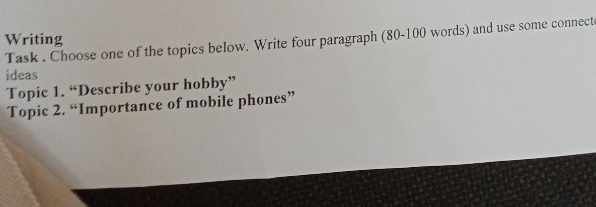 Writing Task. Choose one of the topics below. Write four paragraph (80-100 words) and use some connectors to link your ideas Topic 1. "Describe your hobby" Topic 2. "Importance of mobile phones" пажалуста срочно