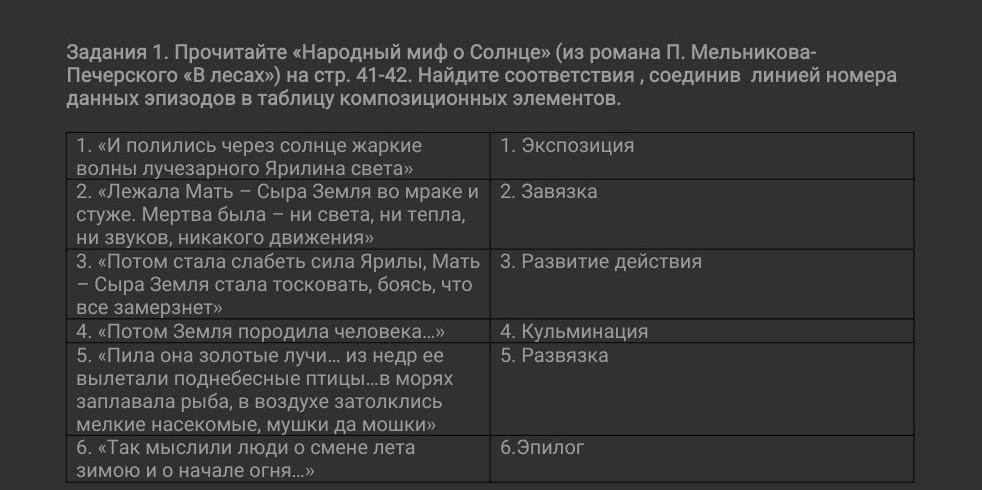 Задания 1. Прочитайте «Народный миф о Солнце» (из романа П. Мельникова- Печерского «В лесах») на стр. 41-42. Найдите соответствия, соединив линией номера данных эпизодов в таблицу композиционных элементов. 1. Экспозиция 2. Завязка 1. > 2. > 5. «Пила она золотые лучи.... из недр ее вылетали поднебесные птицы...в морях заплавала рыба, в воздухе затолклись мелкие насекомые, мушки да мошки» 6. > 4. Кульминация 5. Развязка 6.Эпилог даю 30 баллов