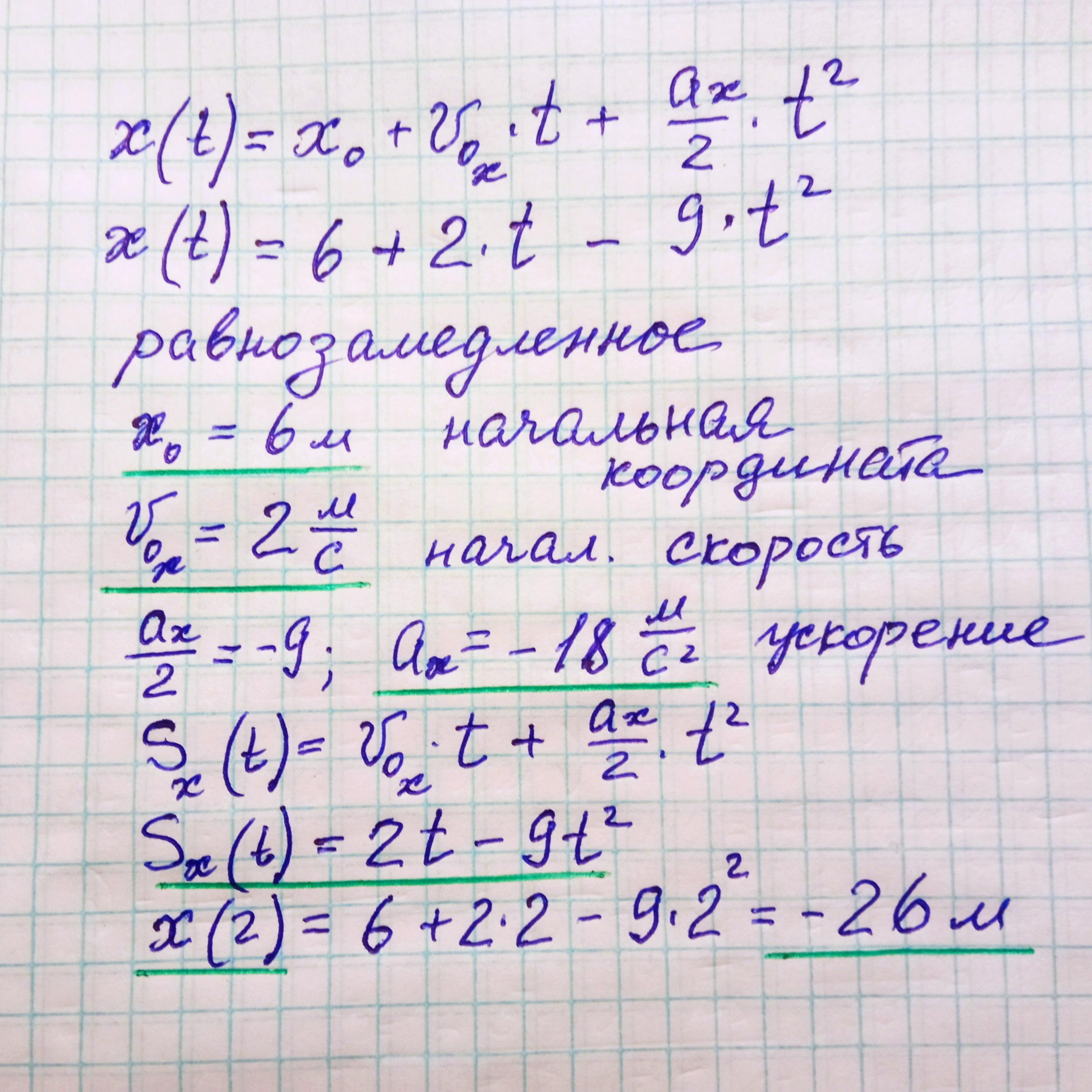 8. Уравнение координаты материальной точки имеет вид: х = 6 + 2t -9t². а) Опишите характер движения точки-1 Определите: 1.)Начальную координату, начальную скорость, ускорение-з b) Запишите уравнение перемещения.-2 c) Найдите координату тела через 2 с.-1